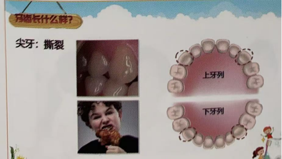 而牙齿有哪些作用呢?第一:咀嚼食物,牙齿能帮助孩子切割和充分的碾磨食物,和我们的唾液混合在一起成为消化食物,吸收营养的第一关。食物如果不能充分咀嚼,直接进入到胃部,会给胃肠道添加额外的负担,造成消化不良。另外咀嚼也能刺激颌面部骨骼的形成。第二:协助发音,我们讲话唱歌唇齿音需要牙齿的帮助。第三:维持面部外形,如果没有牙齿了,我们的面型会变苍老,对儿童来说,即使是换牙期没牙都会害羞的不愿意说话呢。儿童的发音不清及面部外形不协调,都可能会影响孩子的心理健康,所以我们得好好的保护乳牙。 如果我们仔细观察一下牙齿的形态,它们都是不一样的,因为它们都行驶着不同的功能,切牙又称门牙,适用于切割食物的。尖牙,又俗称虎牙,能撕碎食物。磨牙:前牙切碎的小块食物进一步碾磨。