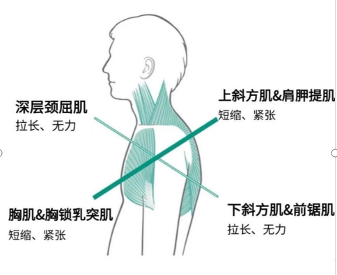 “圆肩驼背颈前倾”---您了解上交叉综合征吗?时间:2025-12-26 浏览量:1100 来源:自贡市第四人民医院 作者:一、何为上交叉综合症 上交叉综合征是指由于长时间低头伏案或过度锻炼胸部肌肉造成相应部位肌肉不平衡,形成头部前倾(颈椎正常弧度减少或变直)、含胸(圆肩)、驼背(胸椎曲度增加)、肩胛骨耸起等形体的变化,进而导致一系列身体不适的各种症状。