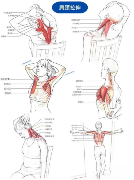 取立位、坐位或平卧位,初学时以平卧位容易掌握。两膝半屈(或膝下垫小枕),使腹部放松。两手分别放于前胸和上腹部;用鼻缓慢吸气时,膈肌最大程度下降,腹肌松弛,腹部手感向上抬起,胸部手在原位不动,抑制胸廓运动;呼气时,腹肌收缩腹部手感下降)帮助膈肌松弛,膈肌随腹腔内压增加而上抬,增加呼气潮气量。同时可配合缩唇呼气法,每天进行锻炼,时间由短而长,逐渐习惯于平稳而缓慢的腹式呼吸。 2)拉伸与松解紧张肌肉 胸大肌、胸小肌、背阔肌、大圆肌拉伸 斜方肌上束、肩胛提肌、斜角肌、胸锁乳突肌拉伸