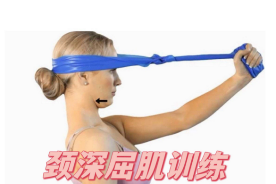 3)训练与强化薄弱肌群颈深屈肌 采用橡皮带训练。两手握住橡皮带,从头后绕过。头部向后用力,与向前拉的力量作对抗。